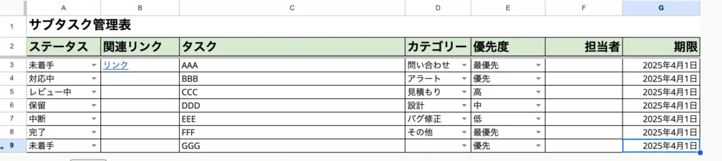 タスク概要や優先度や期限完了はまだと思いますが、それ以外はぶっちゃけ不要です。私はスケジュールが視覚的にわかりやすいように日付スケジュールも導入して、タスクの開始日から期限日までを自動的にセルの背景色を変えるようにして管理しています。