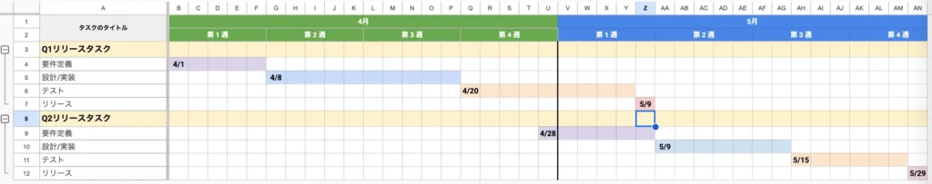 例えばリリースごとにスケジュールを立てたり、タスクにかかりそうな工数やタスクの期限日や視覚的にわかりやすくするのであれば、日付のスケジュール付きで管理するのも良いでしょう。