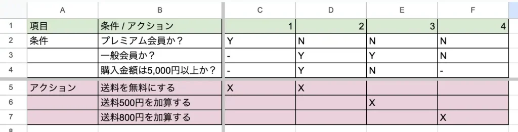 下記の画像の例でいくと、ケースNo.1では条件がプレミアム会員の場合、アクションとして送料を無料にするが期待動作となります。ケースが複雑になっていくほどYやNが増えていくので、ケース作成は大変ですが、表形式で表せるのでもれなくケースを洗い出すことができます。