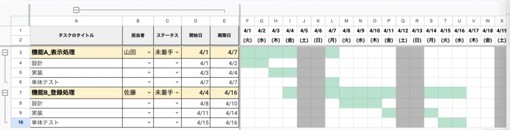 ・開始日と期限日を入力すると、自動的にスケジュールのセルの背景色が変わる(緑色になる)