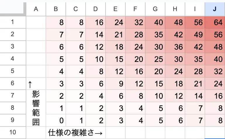 影響範囲や仕様の複雑度で客観的に算出し、例えば仕様の複雑度が3、影響範囲が2であれば、タスクの重みは6となります。数字が大きくなればなるほどタスクの重みも重くなるため、仕様の複雑度が大きくなり、影響範囲も大きくなります。