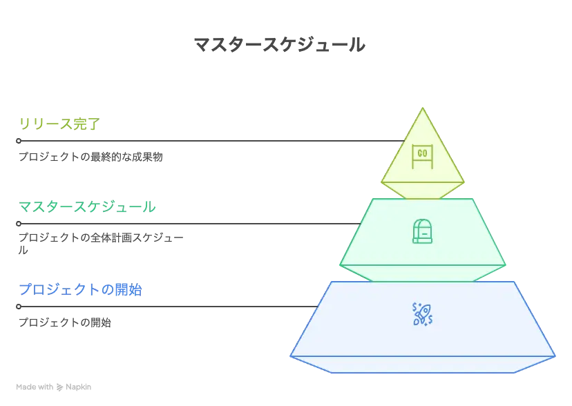 マスタースケジュールとは、プロジェクト全体の開始からリリース完了までの主要な「山場」を、1枚のガントチャートなどで可視化した全体計画のことです。