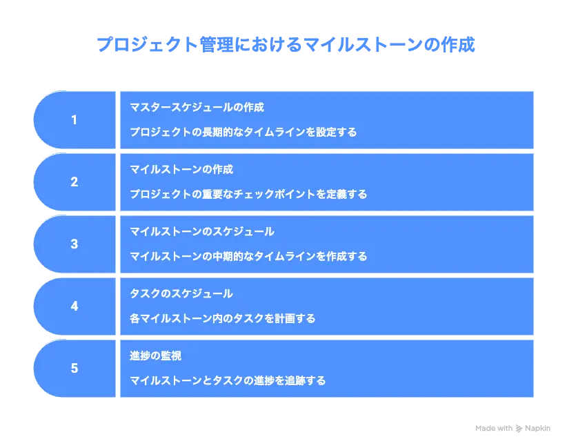 マスタースケジュールが長期的で全体がわかるスケジュールとすれば、マイルストーンは中期的なスケジュールを立てるのに役立ちます。